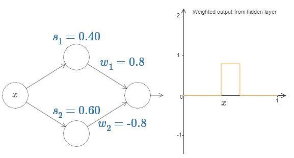 Also, try changing the step point $0.30$ associated to the top hidden neuron. Witness how it changes the shape of the bump. What happens when you move it past the step point $0.70$ associated to the bottom hidden neuron?