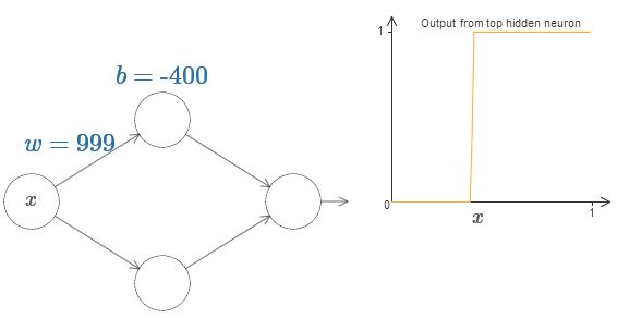 It's actually quite a bit easier to work with step functions than general sigmoid functions. The reason is that in the output layer we add up contributions from all the hidden neurons. It's easy to analyze the sum of a bunch of step functions, but rather more difficult to reason about what happens when you add up a bunch of sigmoid shaped curves. And so it makes things much easier to assume that our hidden neurons are outputting step functions. More concretely, we do this by fixing the weight $w$ to be some very large value, and then setting the position of the step by modifying the bias. Of course, treating the output as a step function is an approximation, but it's a very good approximation, and for now we'll treat it as exact. I'll come back later to discuss the impact of deviations from this approximation.